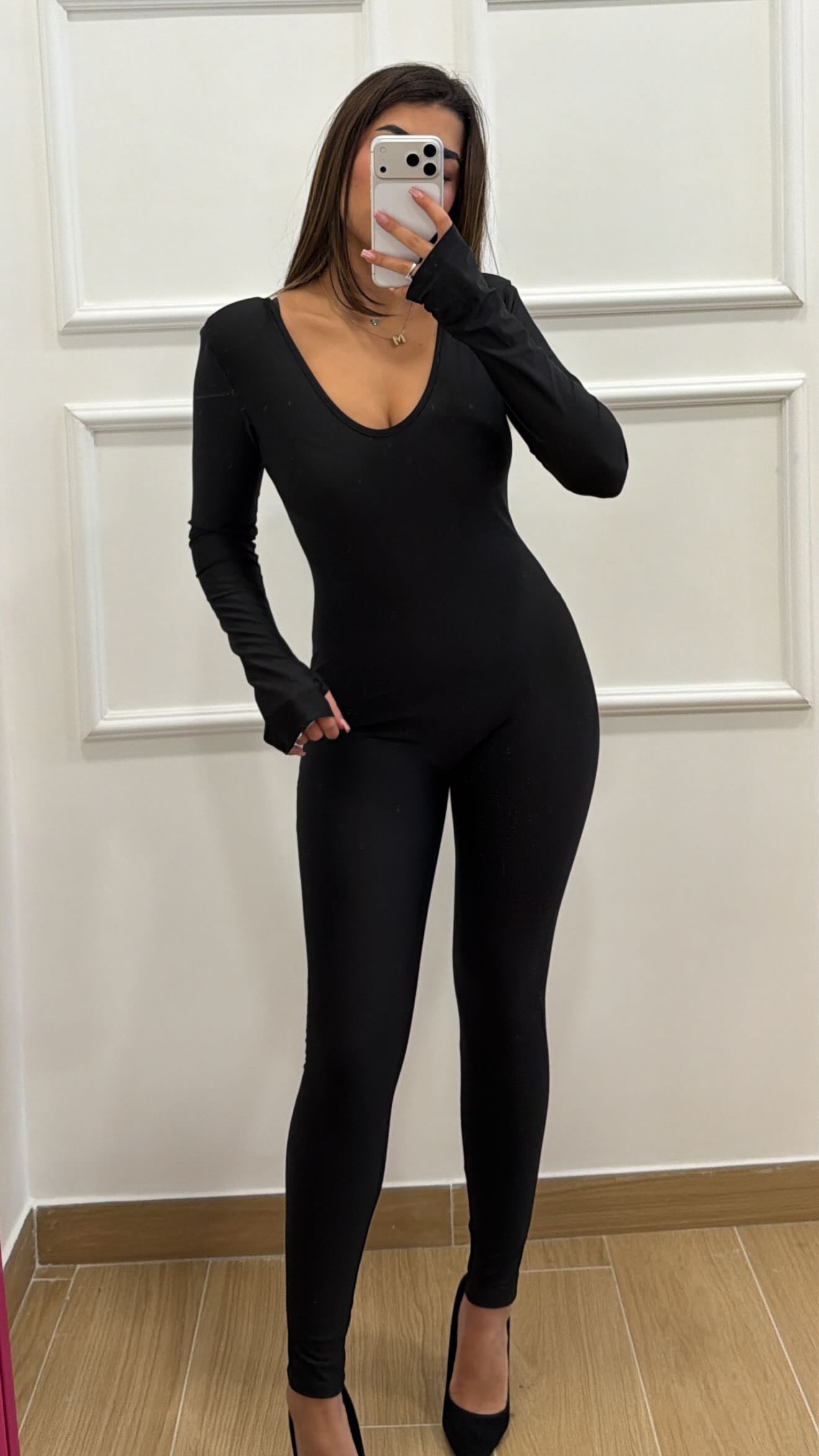 Tuta in lycra con scollo profondo spalline e manica a guanto