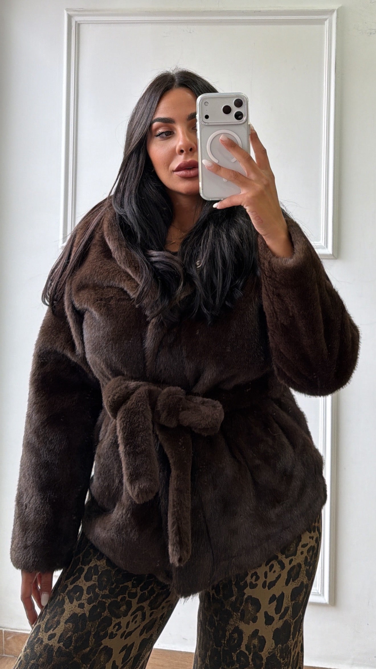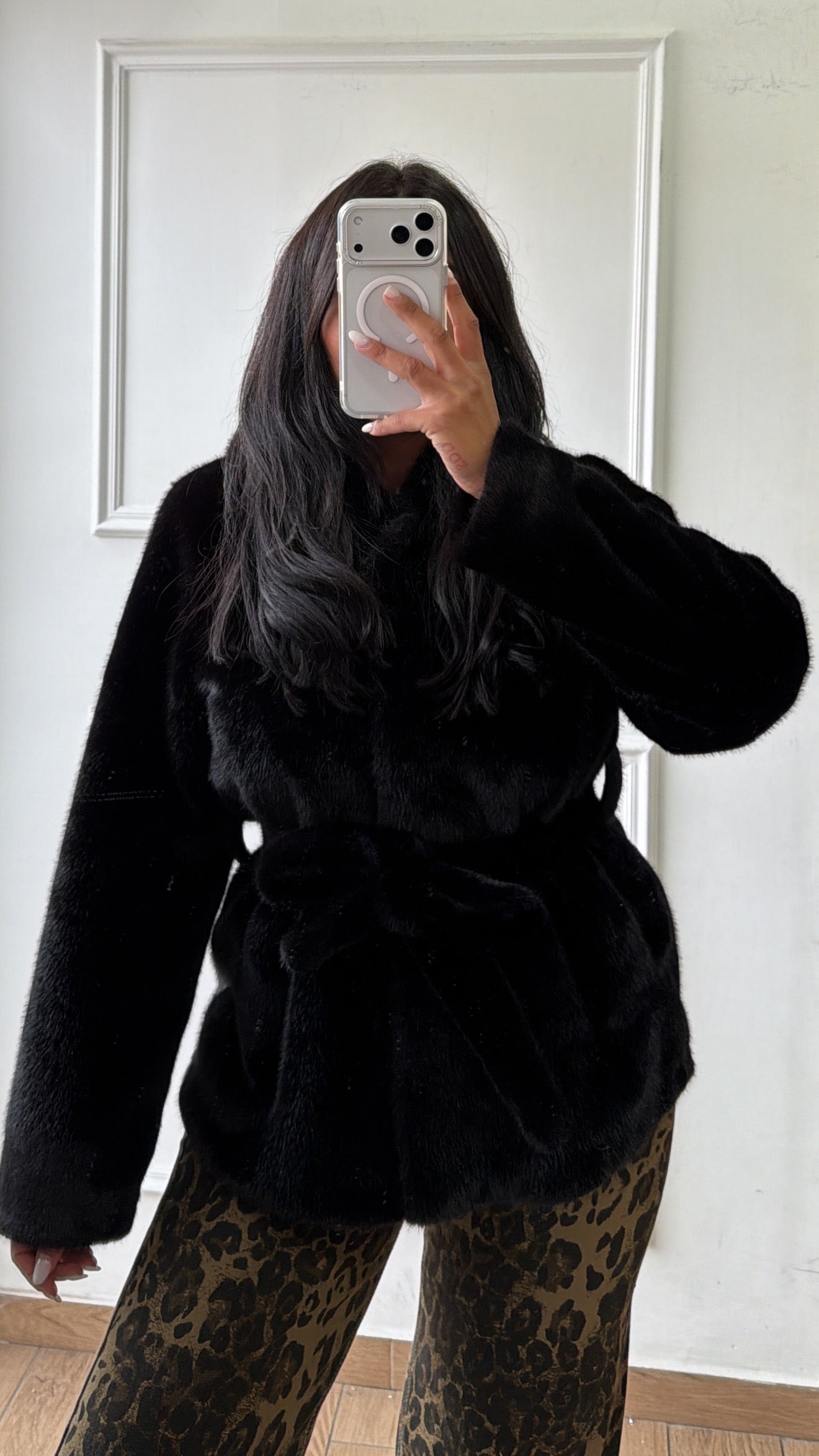 ECOPELLICCIA con cappuccio e cintura mood visone taglia unica vestibilità fino alla taglia L.
