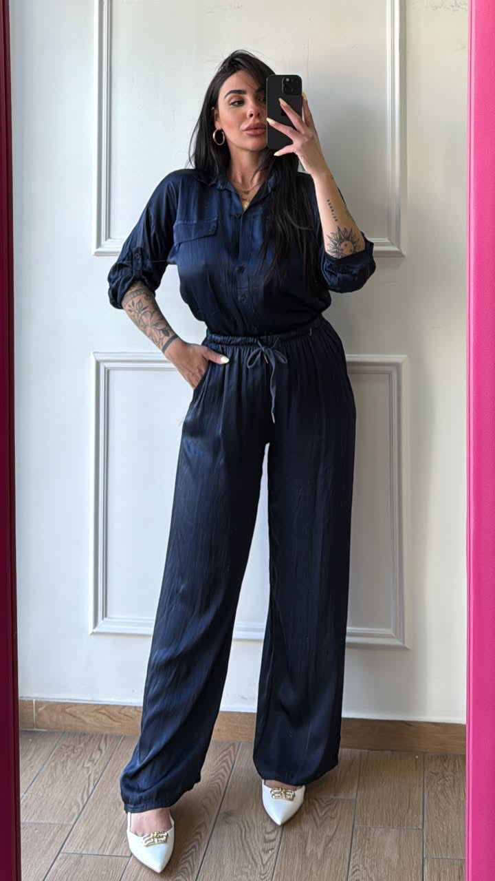 Coordinato in raso composto da pantalone e camicia in raso, vestibilità fino alla taglia XXL