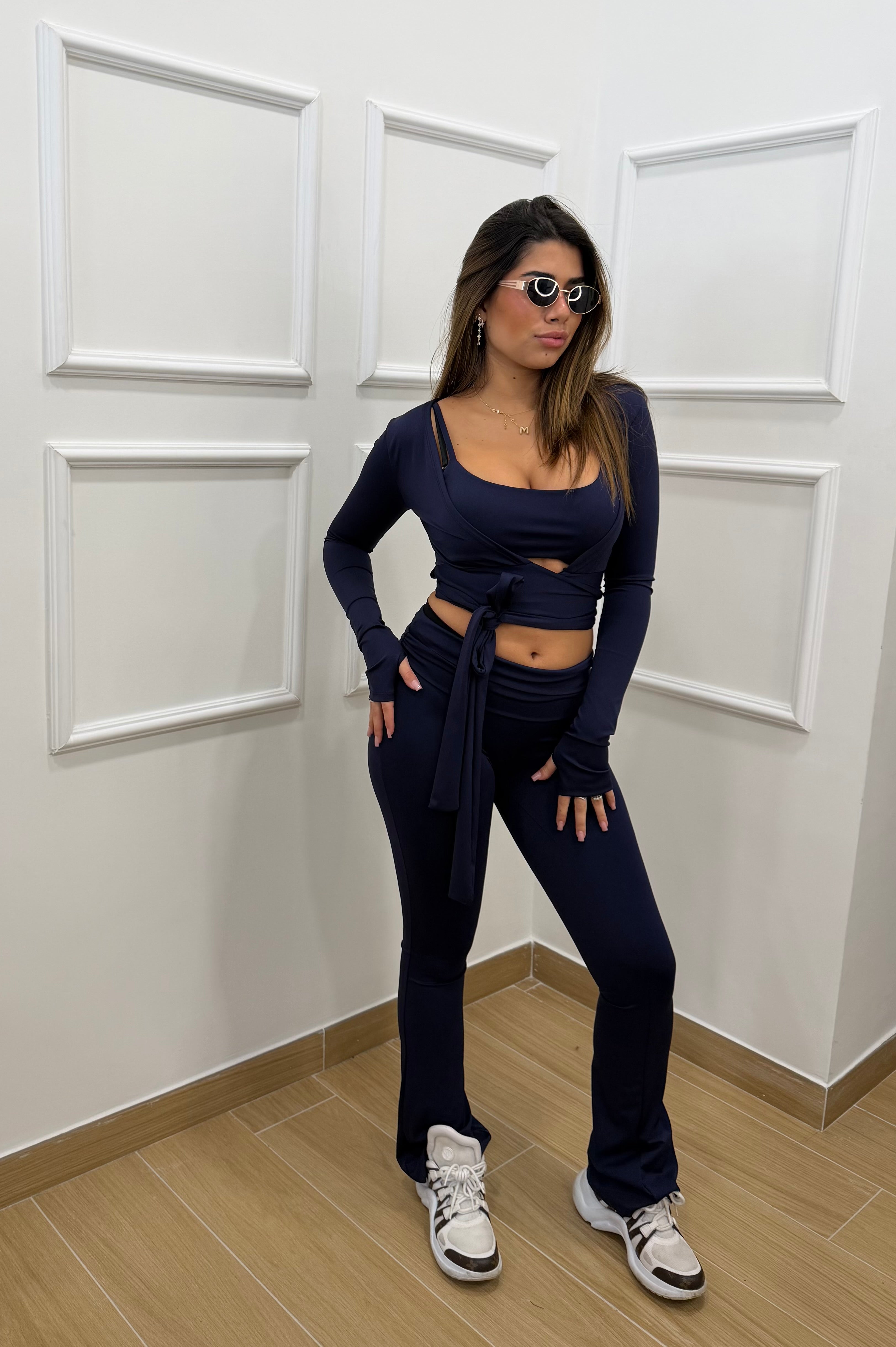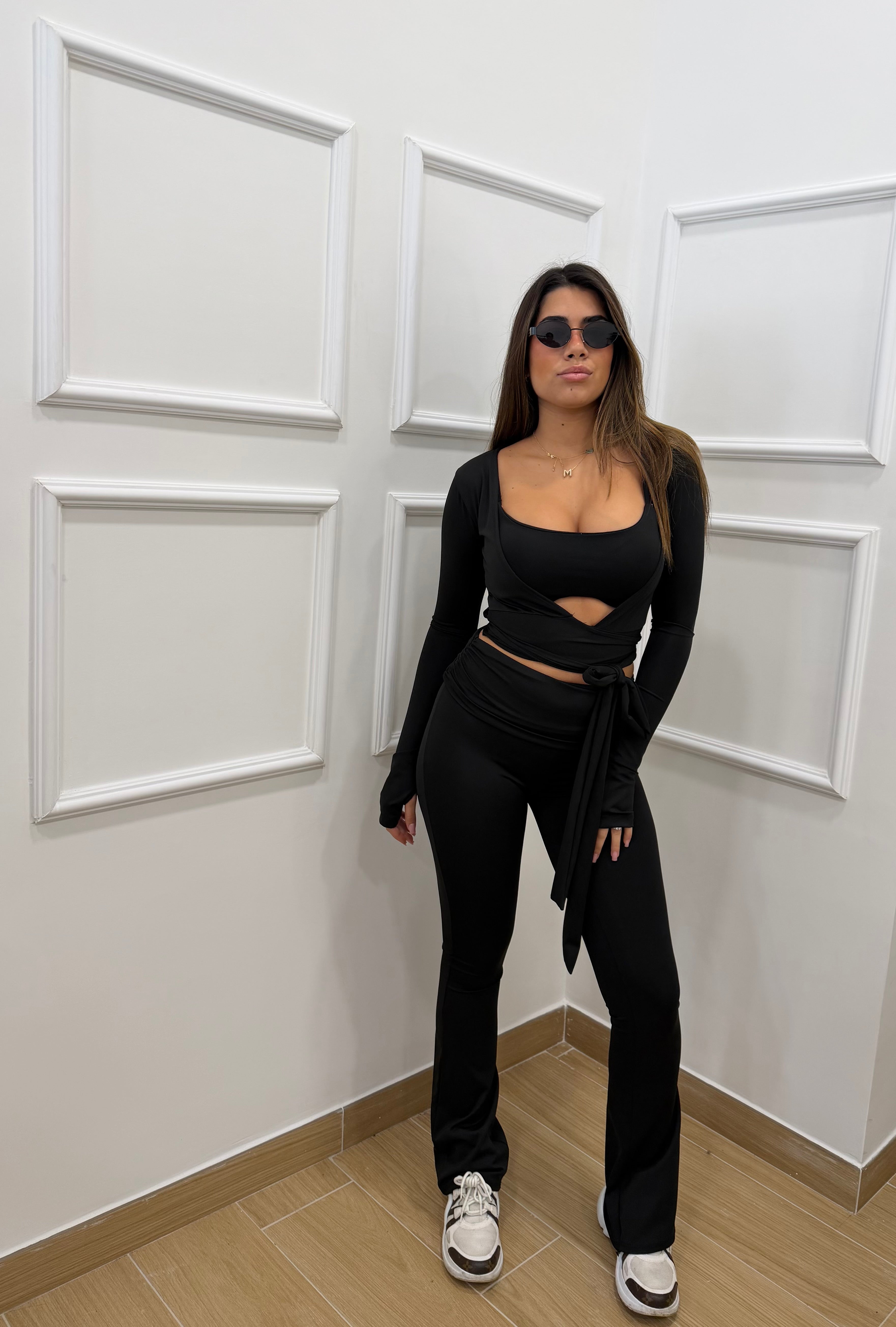 Coordinato in lycra composto da pantalone push-up top e incrociatina con manica a guanto in lycra taglia unica