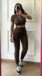 Coordinato costina maglia mezza manica con zip , leggins elasticizzato contenitivo . Taglia unica
