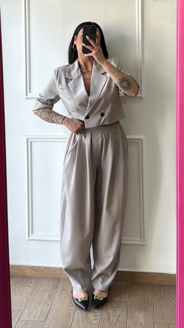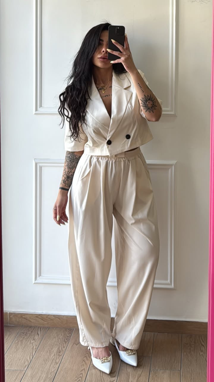 Tailleur composto da giacca crop mezza manica e pantalone palazzo con elastico, vestibilitá fino ad una 50.