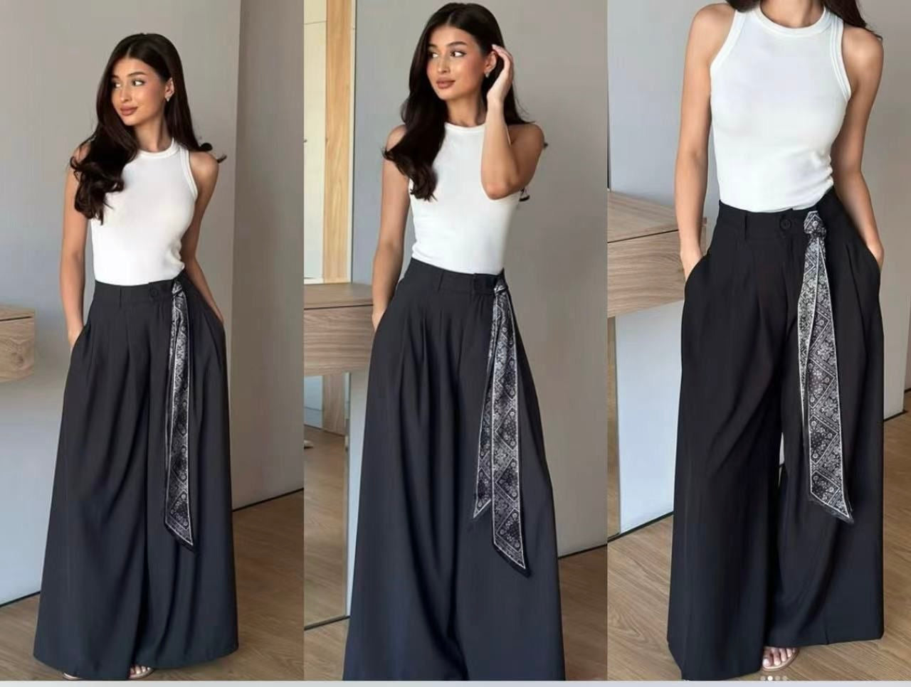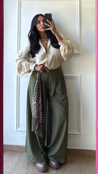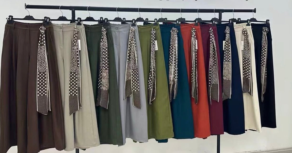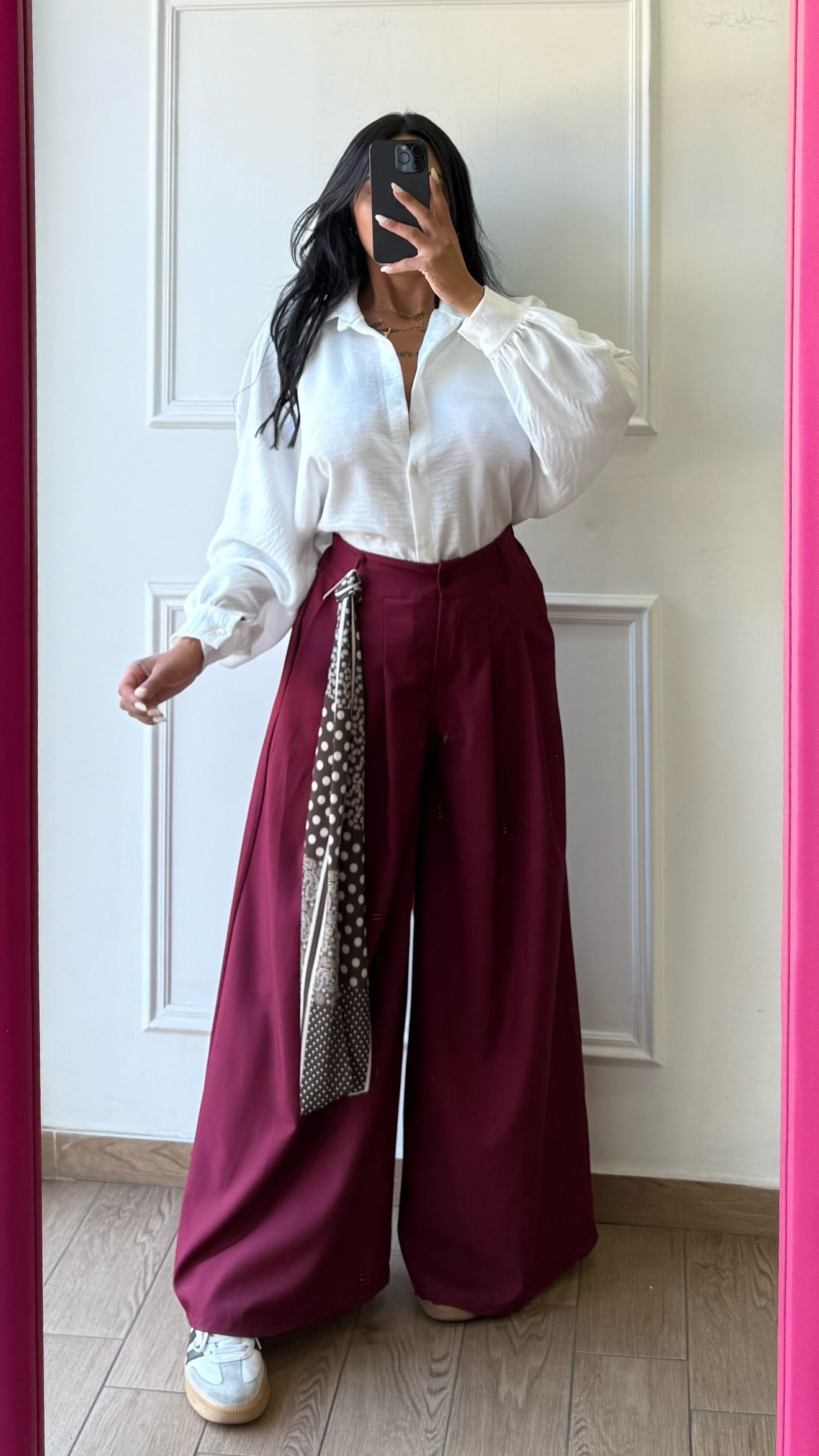 Pantalone a palazzo molto ampio con elastico sul retro taglia unica e foulard in vita compreso.