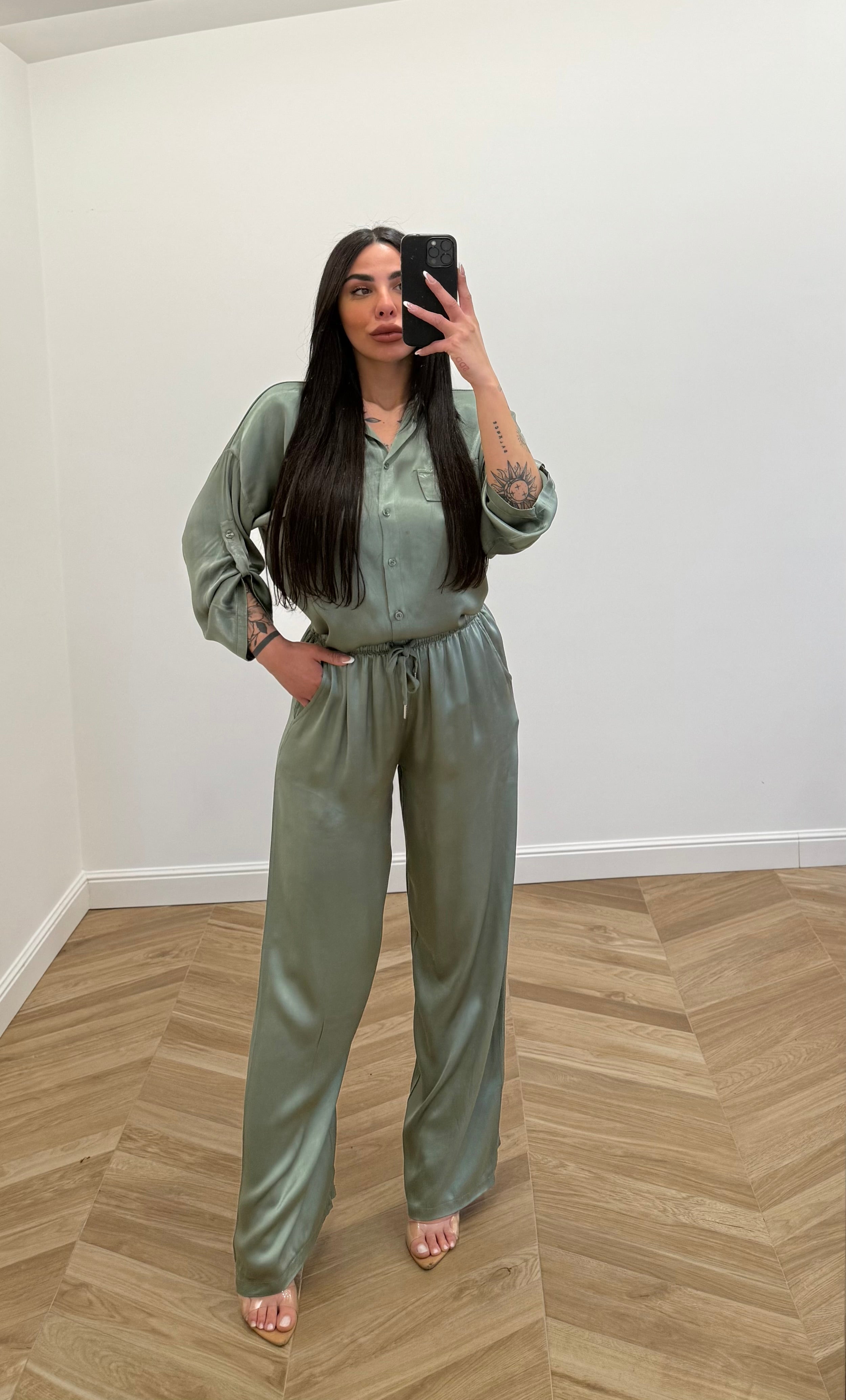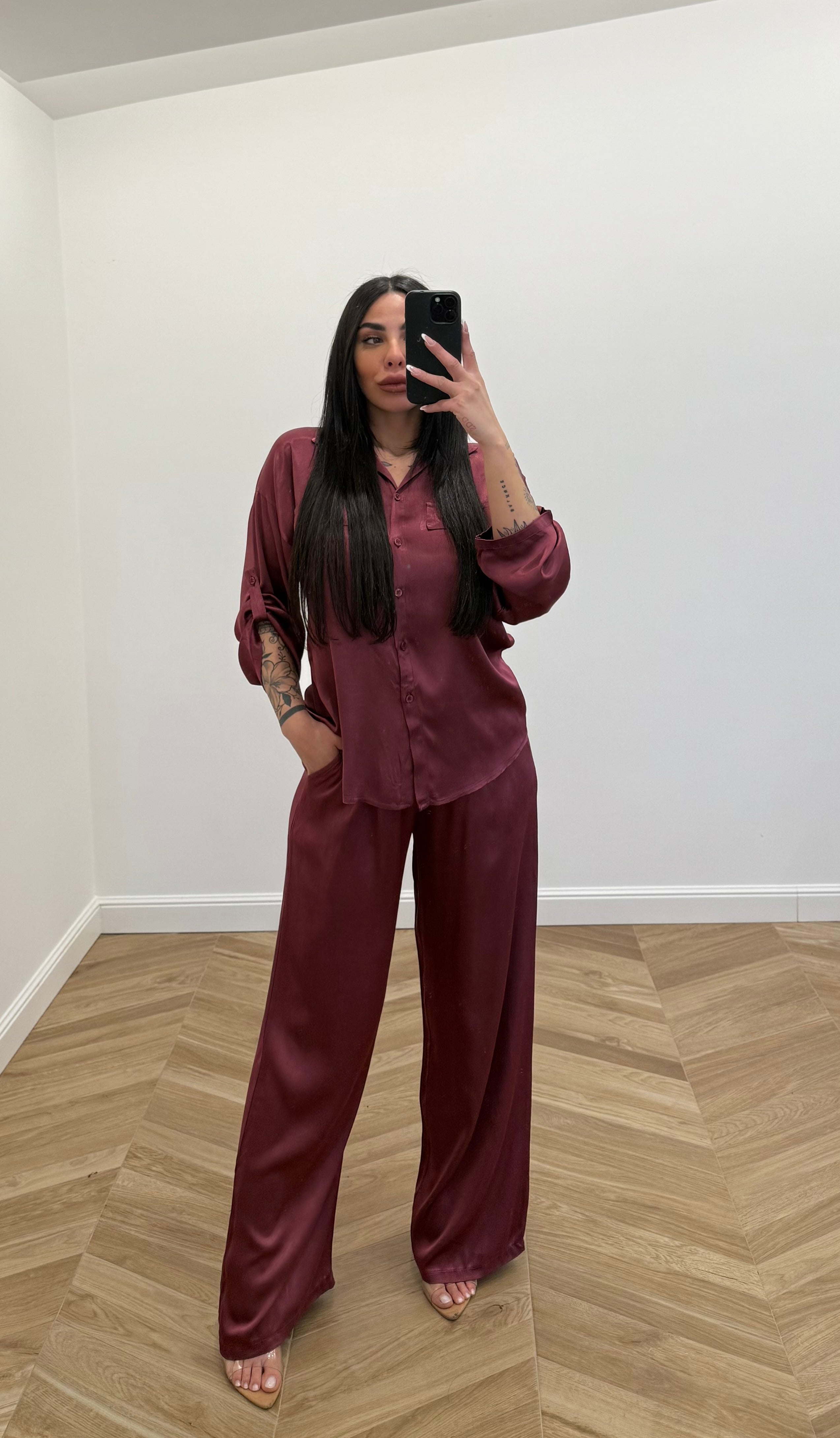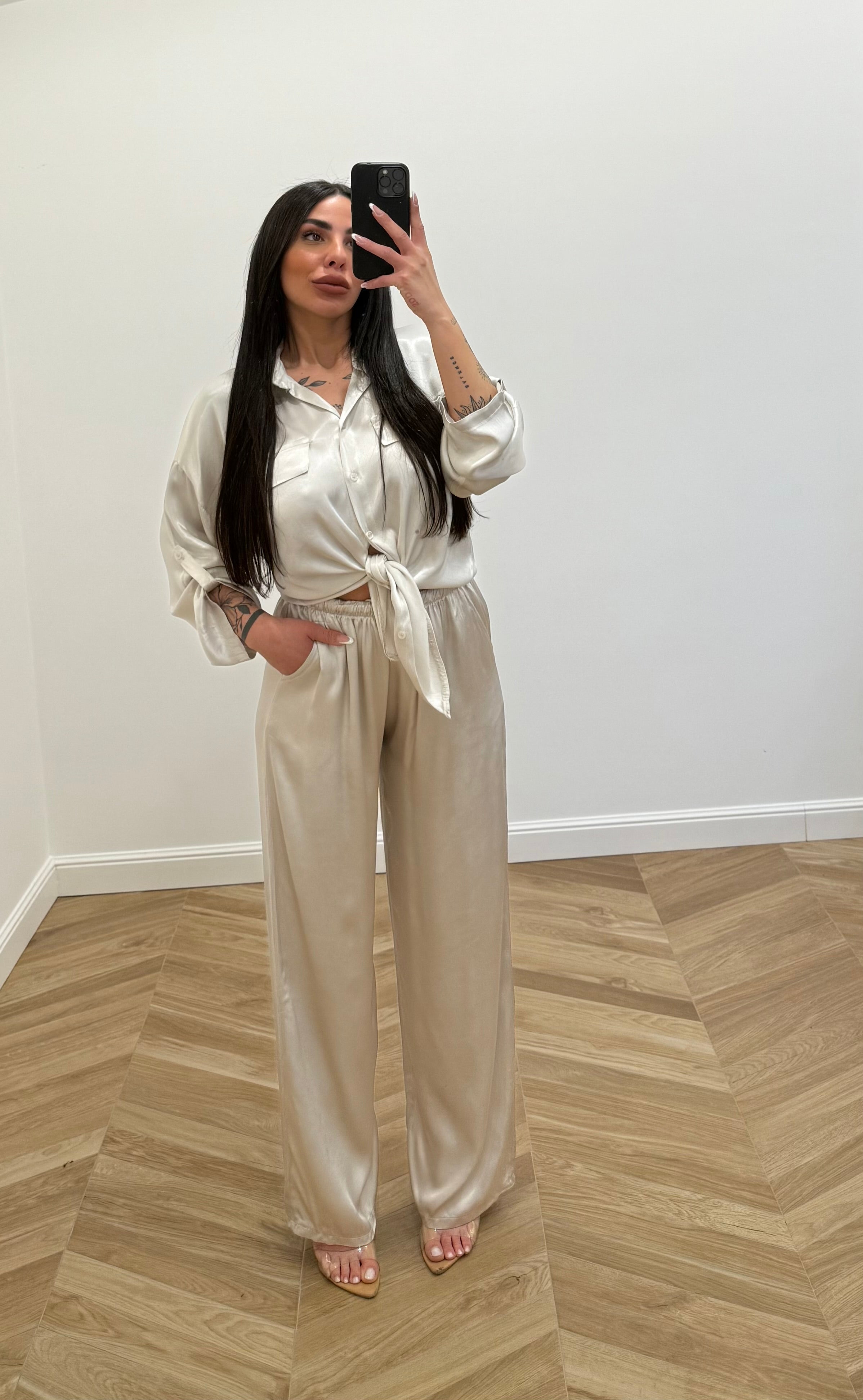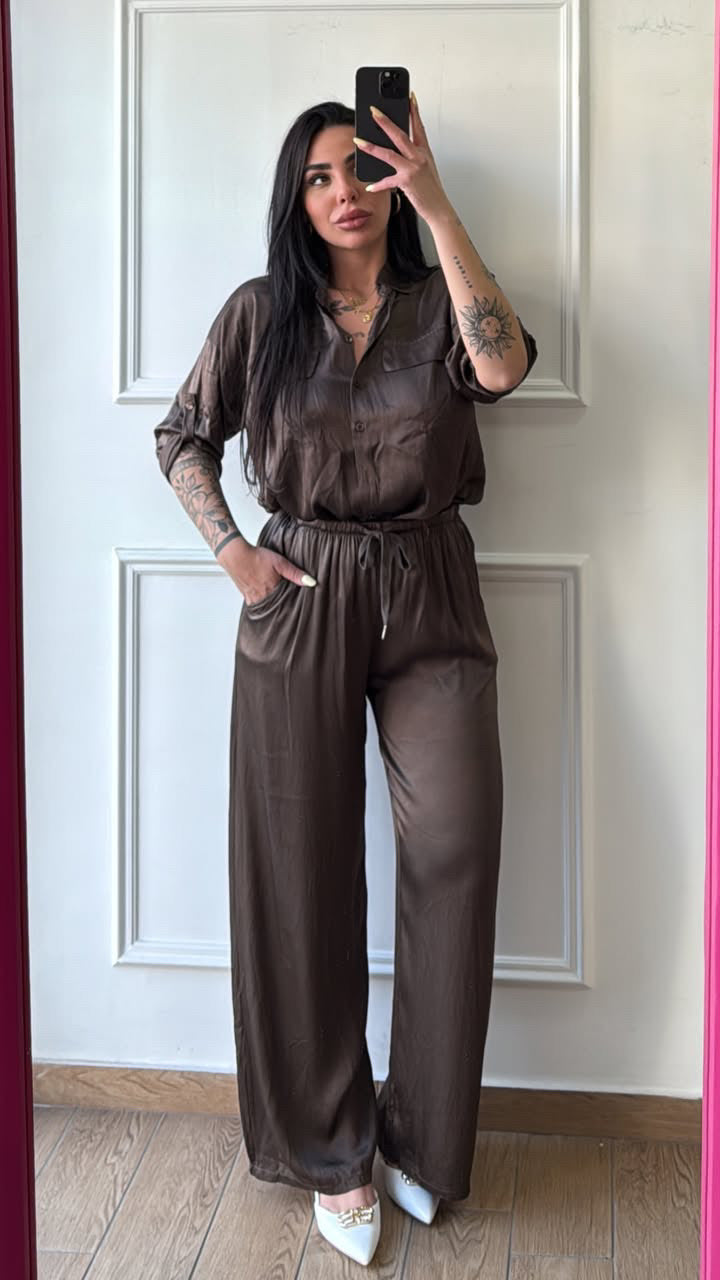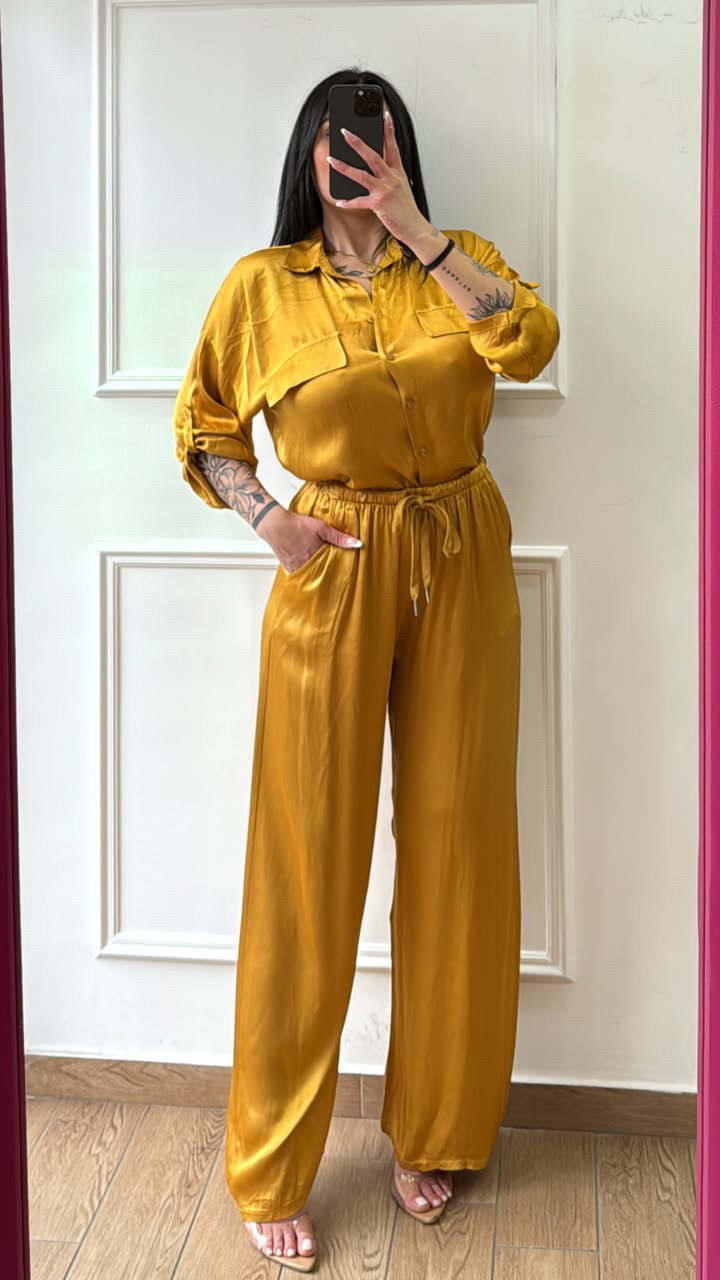Coordinato in raso composto da pantalone e camicia in raso, vestibilità fino alla taglia XXL