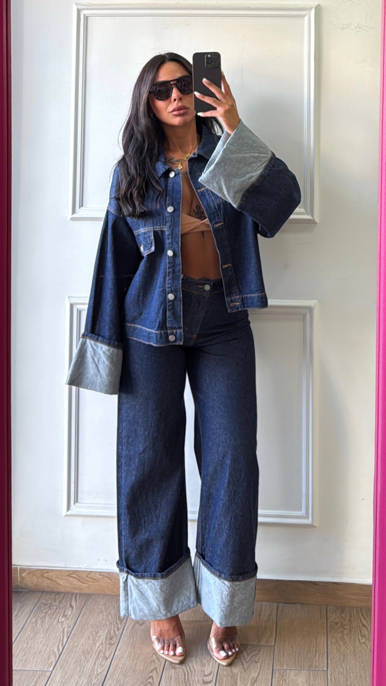 Coordinato in denim, non elastico.