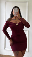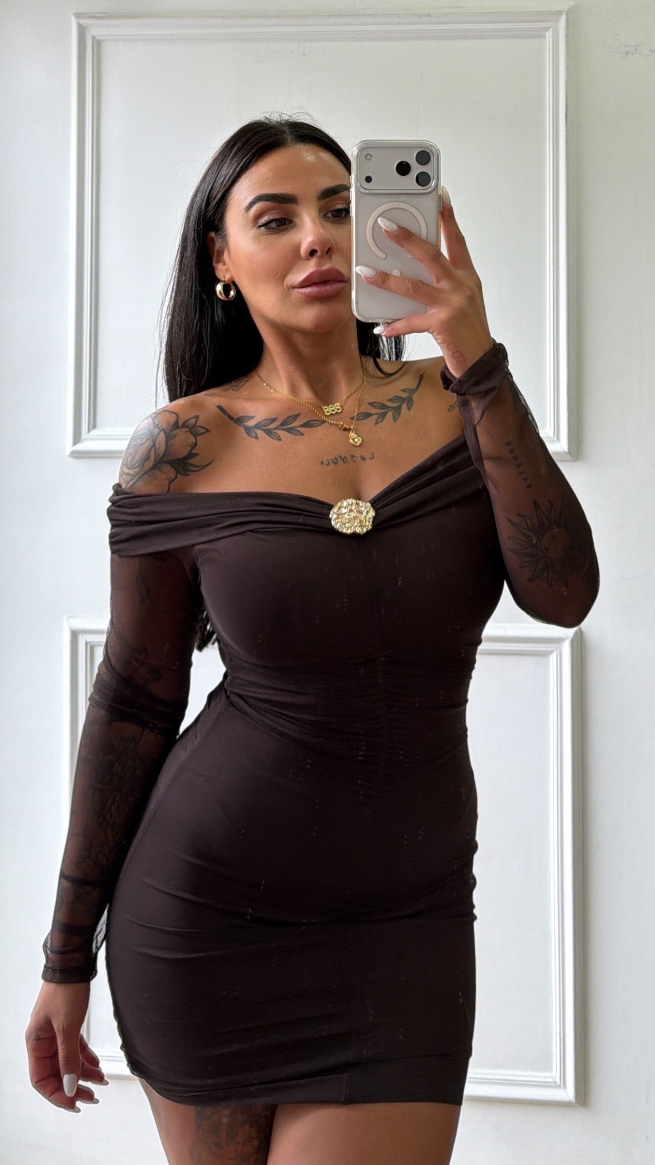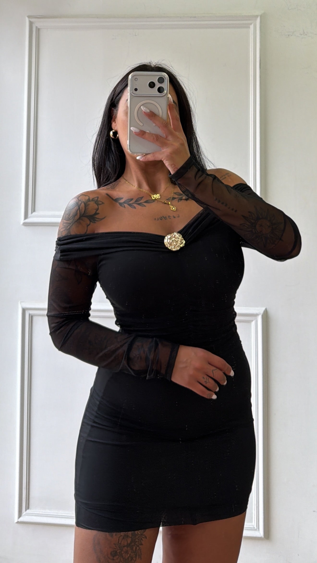 Dress con maniche velate e dettagli in oro, drappeggiato con scollo a barca