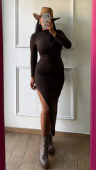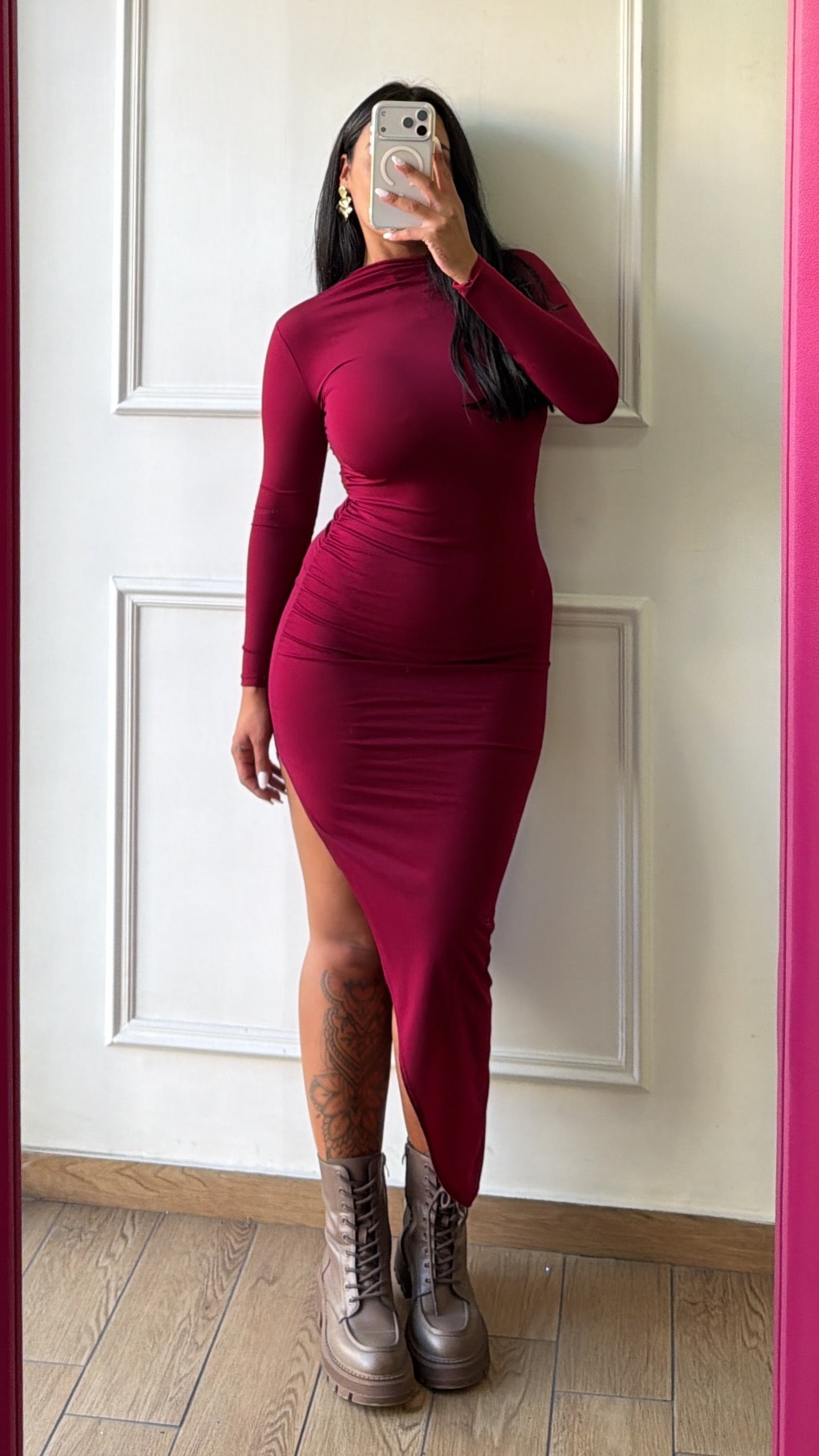 abito lungo con drappeggi laterali e spacco, taglia unica