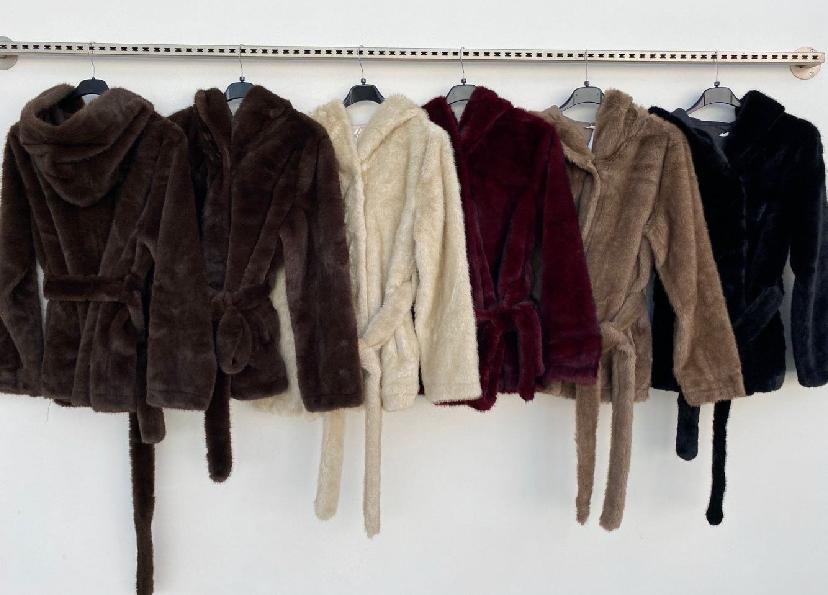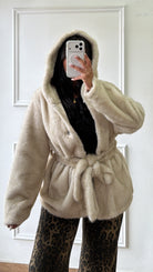 ECOPELLICCIA con cappuccio e cintura mood visone taglia unica vestibilità fino alla taglia L.